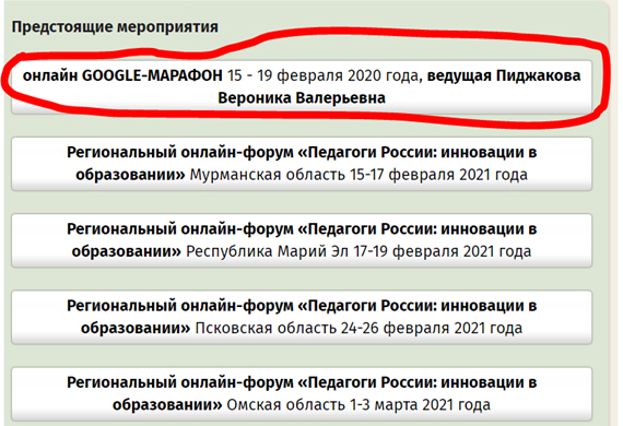 Уважаемые коллеги! С 15 по 24 февраля 2021 года дирекция Всероссийского форума "Педагоги России: инновации в образовании" проводит для педагогов дошкольного и общего образования бесплатный онлайн GOOGLE-МАРАФОН. Ведущая марафона: Пиджакова Вероника Валерьевна, директор Всероссийского форума «Педагоги России».
